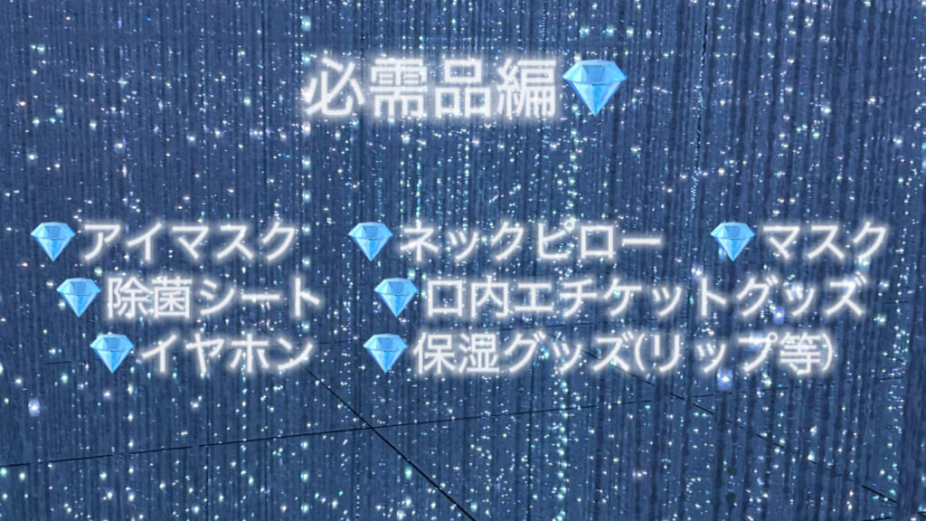 ここでは夜行バスに乗る前のチェックリストとして活用していただけるように、必需品編とあると便利なもの編に分けてご紹介していきます!