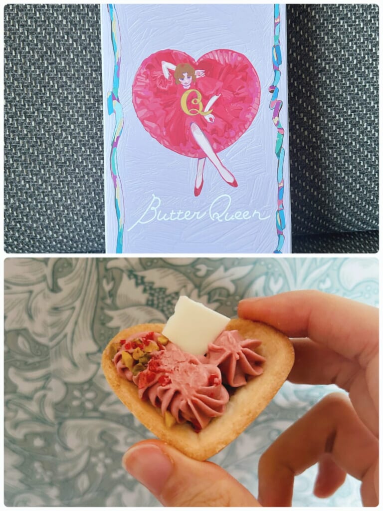 北海道別海町のバターを使ったスイーツブランド「バターの女王」のバタータルト。タルトの上にはストロベリーチョコレートのバタークリームが乗っており、甘いながらも酸っぱさも感じるお味です。