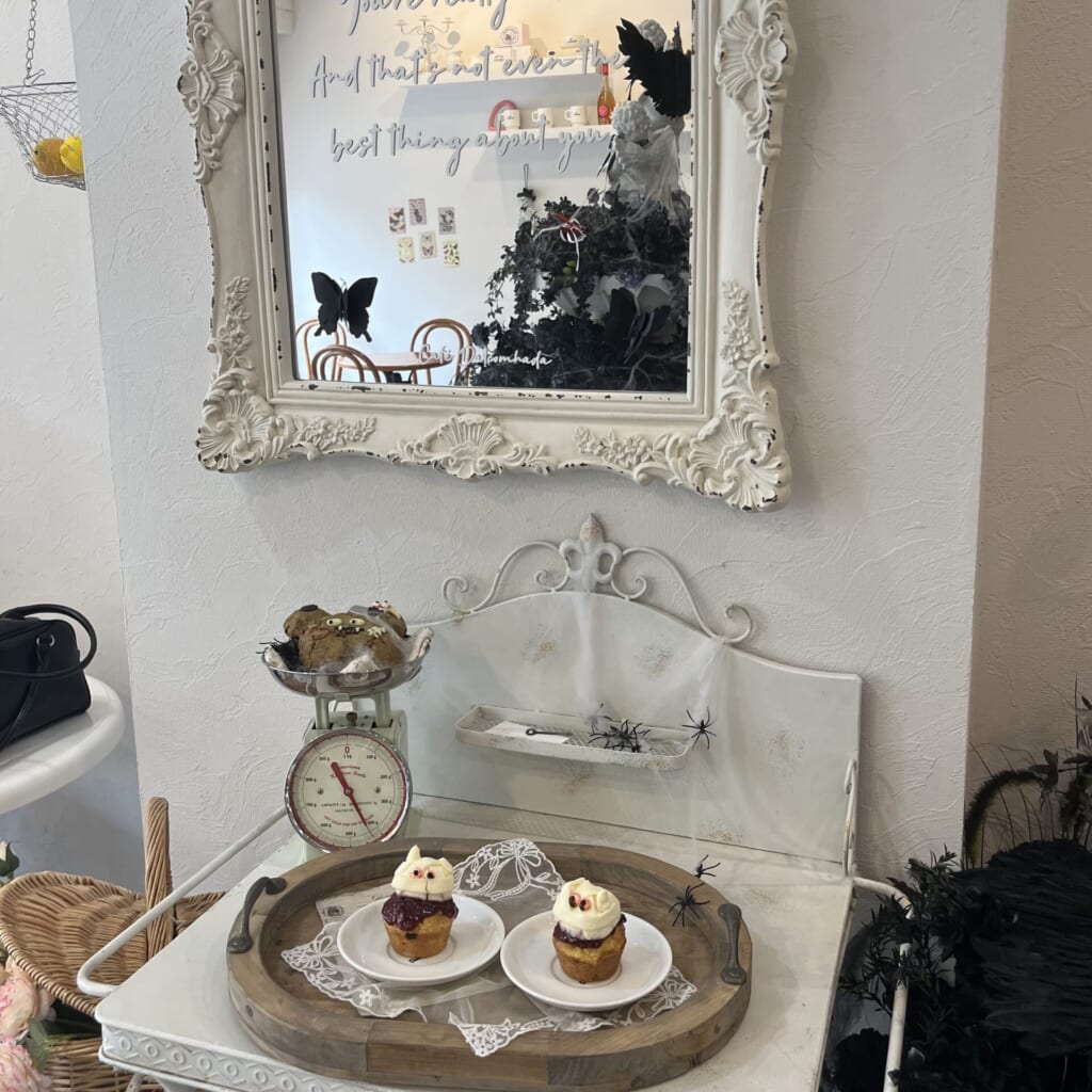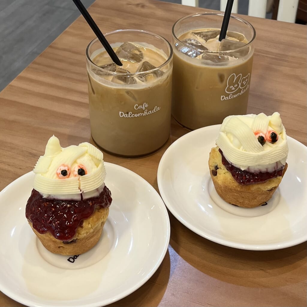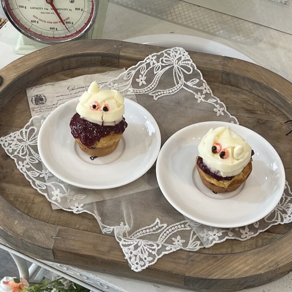 おばけのスコーンやフランケンのスコーン、かぼちゃのチーズケーキなどが並ぶcafe dalcomhadaでわたしが注文したスイーツはミイラスコーン(¥680)。