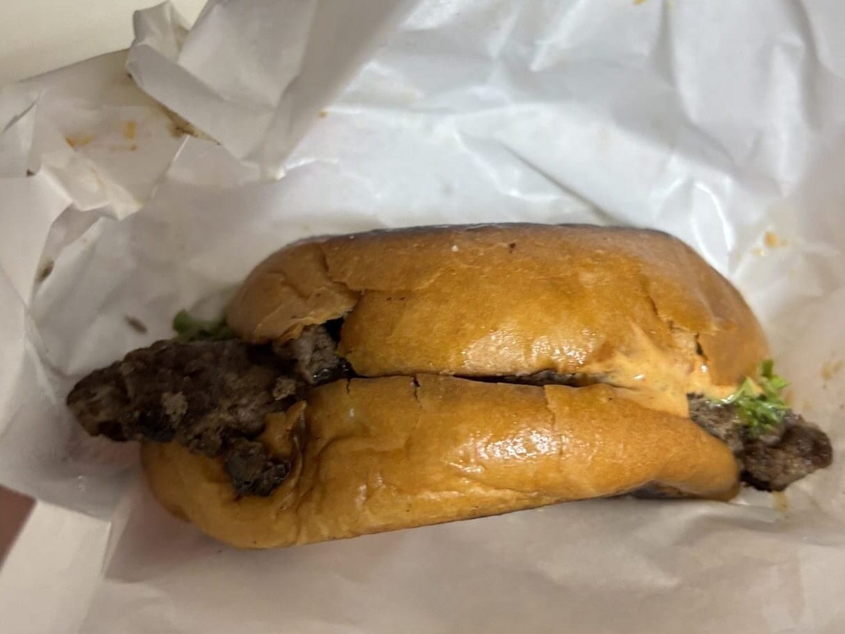 シングル・ダブル・トリプルから選べます!あまりお腹が空いていなくてシングルを選びましたが、食べている途中にダブルにすればよかったと思うくらいおいしいです。しかし、シングルでも極上の和牛が生み出すジューシーさはすばらしく、ウマいという一言で表すのが1番最適解だなと思うほど王道のおいしさを極めています。要はウマいんです。そして、個性的なのがソースです。少しピリ辛で癖になります。トマトやレタスもとってもおいしいです。野菜嫌いの筆者がおいしいと思うんだから、おいしいのでしょう。