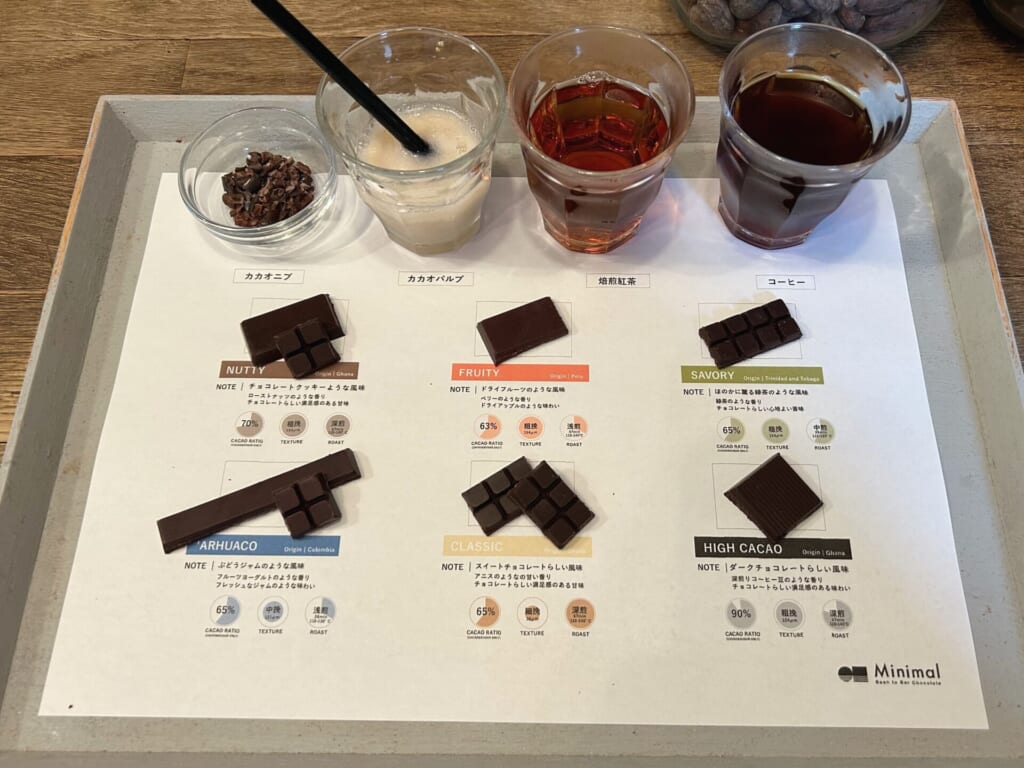 チョコレートの食べ比べができる「Minimal体験セット」が人気メニュー。6種類のチョコレートと、チョコレートに合うコーヒーや紅茶などドリンクが付いたセットです。チョコレートは、それぞれ甘さや苦さが違うことはもちろん、フルーツのような風味など、変わり種も頂くことができます。