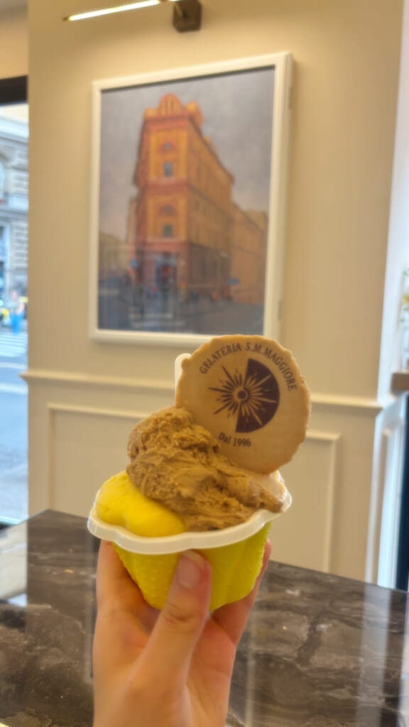 コロッセオから徒歩15分くらいのジェラートのお店です。この日は本当に具合が悪くて食欲がなかったのですが、ローマで何も食べないのが悔しくてジェラートをいただきました!🍨😋とっても美味しかったです!種類がたくさんあって迷いましたが、2種類選べたのでコーヒーとマンゴー味にしました。クッキーのロゴマークも可愛かったです。🙂↕️💖