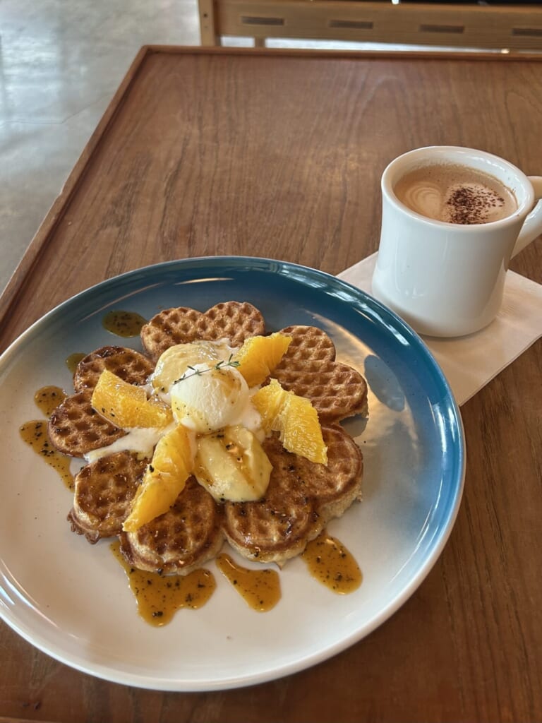ここのフードメニューで人気なのが、見た目がかわいいワッフル。ご飯系からスイーツ系まで幅広い種類のワッフルがありますが、今回は期間限定メニュー「Lemon & Orange Waffle」をご紹介します!