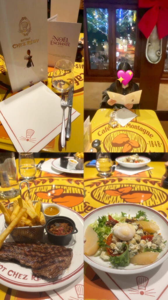 こちらのパークには夜から訪れました!シアター系のアトラクションに加え、見るだけで気絶しそうなバイキング、クラッシュのコースター、タワテラなどがありました。😰😖地図で見ると小さいパークだなという印象だったのですが、絶叫系が好きな方が楽しめそうなアトラクションが多かったので必見です。👀✨私にとって、このパーク一番のお目当てはレミーのレストランです!🤤予約必須です。予約は2か月前から開始されるので忘れないようにしましょう。すぐに埋まってしまうので注意が必要です。店内は私たちがレミーのサイズ感になったことを体感できるような可愛いデザインになっていています!メニューは全てコース料理で、前菜のサラダやメイン、デザートが自分で選べるようになっています!私は前菜とメインのみのコースを選択しました。価格は可愛くないけれど、ずっと行きたかったレストランだったので大満足です。😌🩵