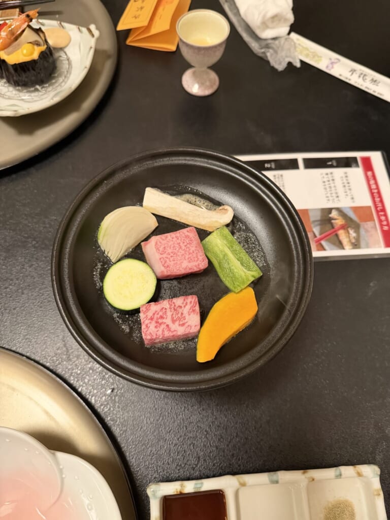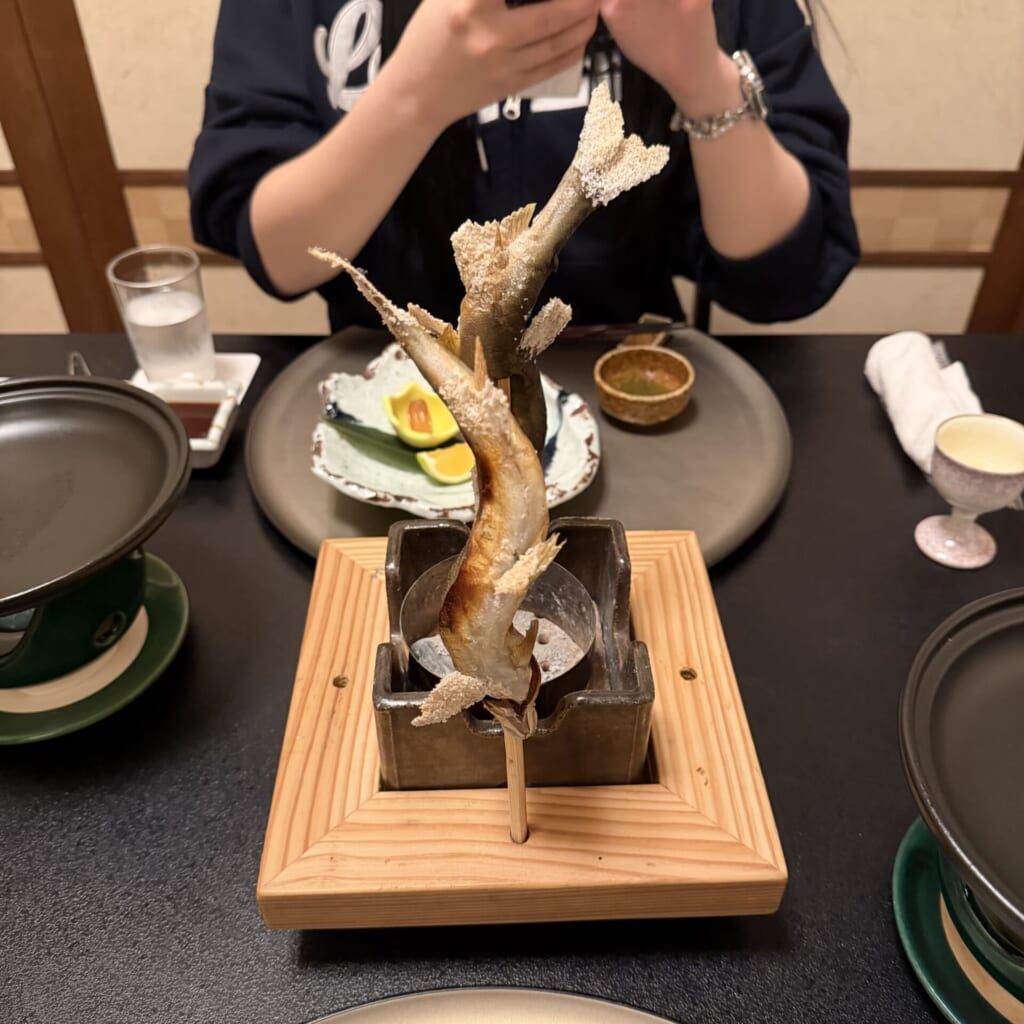 とくに鮎の塩焼きは写真のように提供していただき、テンション爆上がり!黒毛和牛はとっても柔らかく、とろけるような食感でした、、