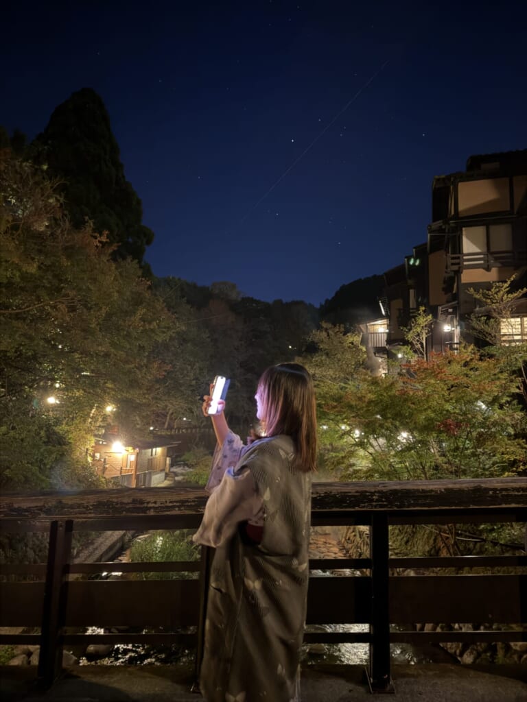 こちらは『丸鈴橋』での写真になります。昼間は紅葉が美しく、夜も宿の明かりなどによりとっても綺麗な景色でした。星も綺麗に見えます☆