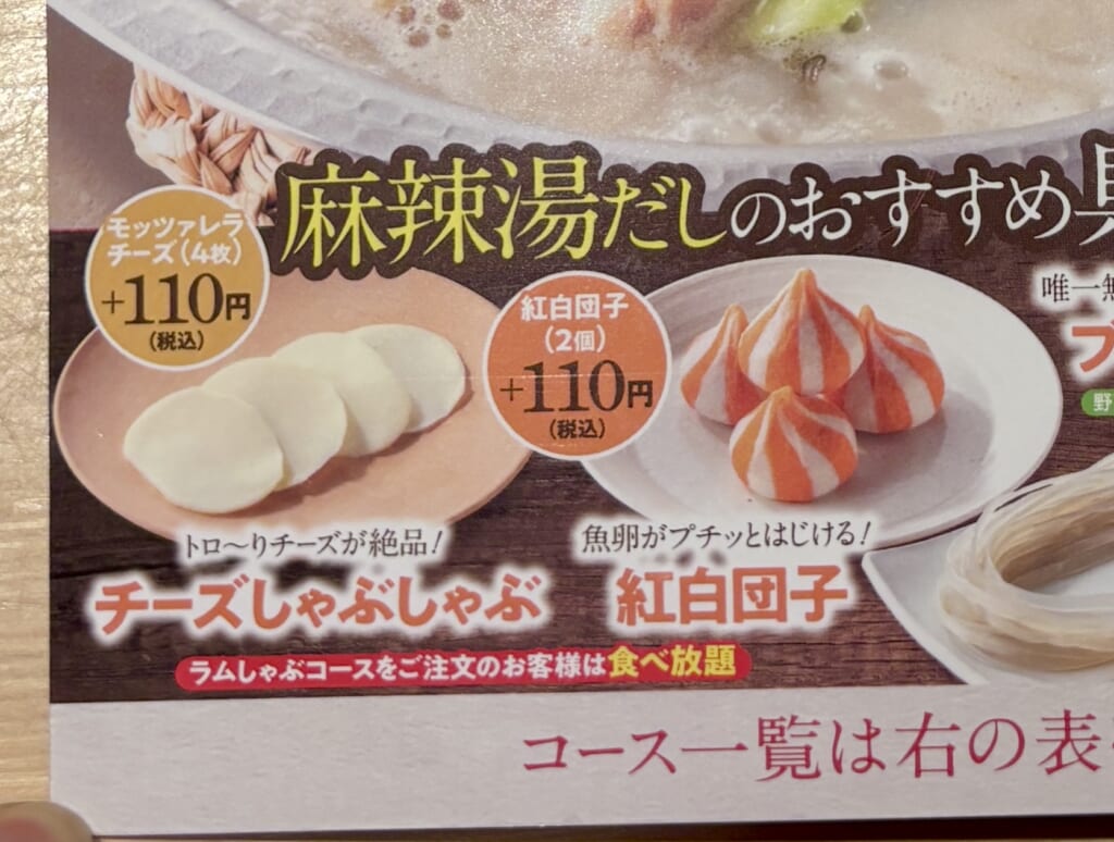 2つのラムしゃぶコースでは、麻辣湯には欠かせない麻辣湯だし、紅白団子やチーズが食べ放題に含まれています!🎪🧀