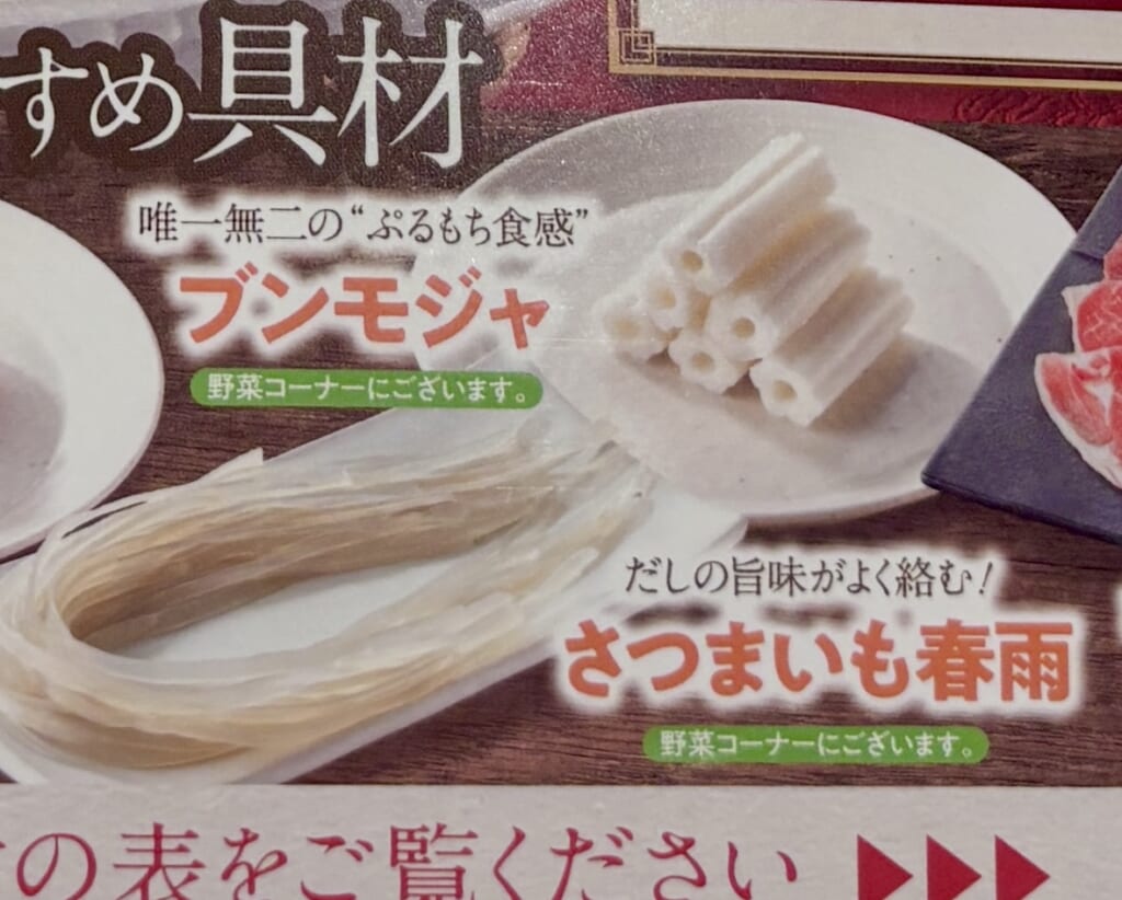 ブンモジャやさつまいも春雨は、野菜コーナーに置いてあるためどのコースでも食べることができます!
