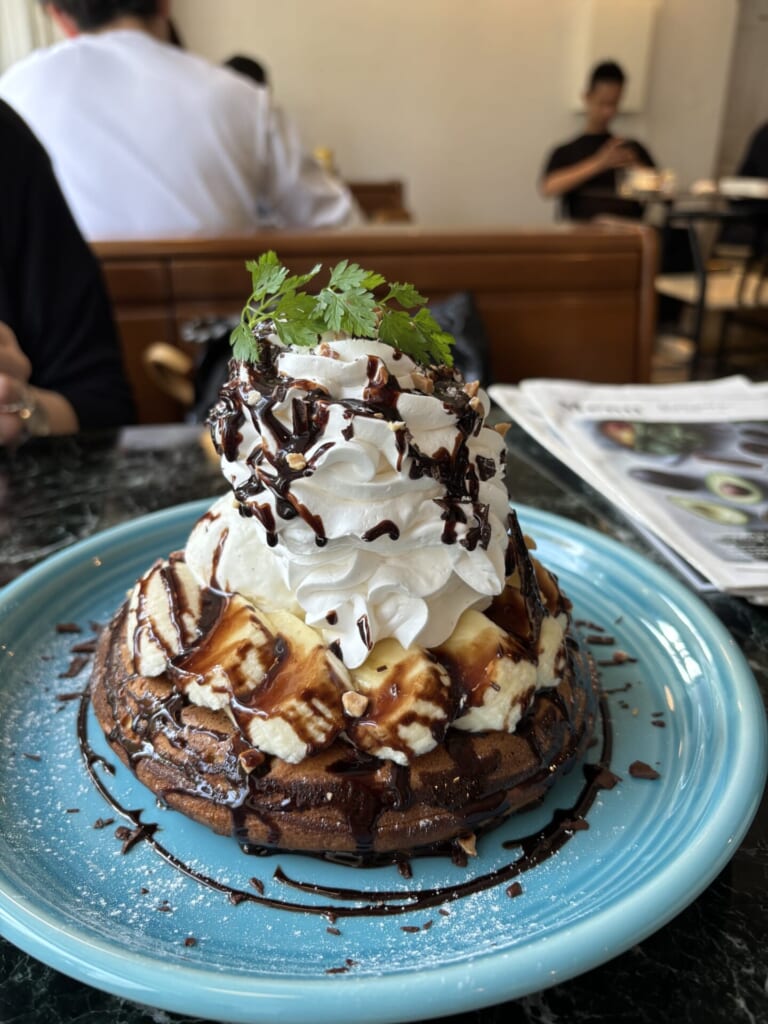 「特製パンケーキ」のバナナ添えをいただきました!生クリームたっぷりでおいしすぎました😋このパンケーキはnon-no6月号の『「ごはんに行く日」のメイクレシピ』(78ページ~)でも登場していて、紺野彩夏ちゃんがパンケーキをほおばったショットが採用されています💕