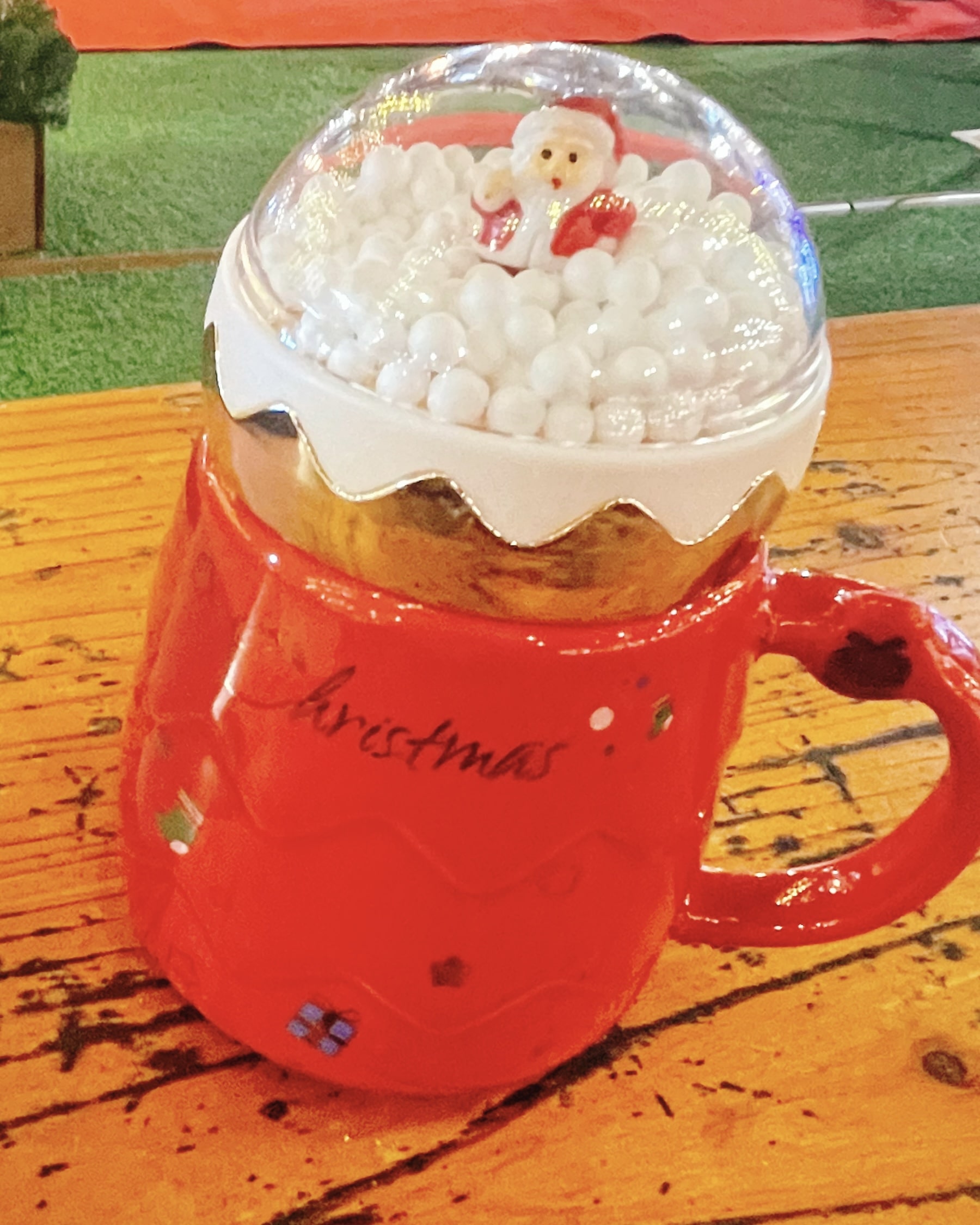 クリスマス仕様のマグには、ココアパウダーやドライストロベリー、クリームが入っていました。