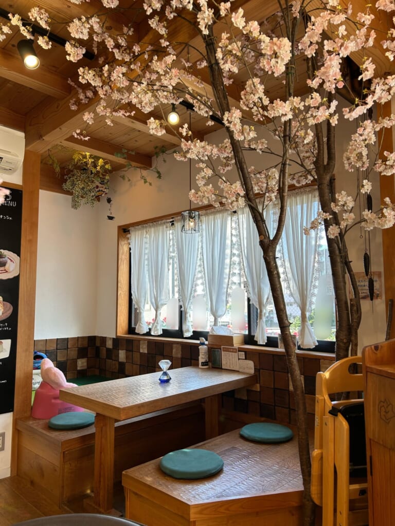 上の写真は2階の飲食スペース。店内には至る所に桜が設置されており、気分は春のよう♪この桜は1年中飾られているため、季節関係なくお花見気分を味わえます!