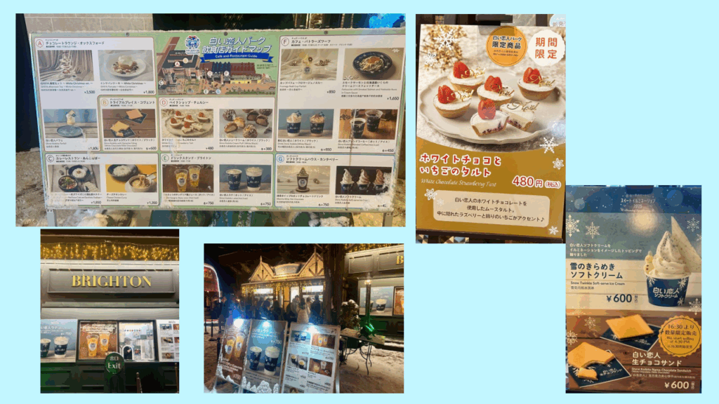 イルミネーション期間限定のメニューや普段は有料エリアでしか味わえない「白い恋人生チョコサンド」が特別に販売されていました!これらのショップは、日中も営業しているそうなので、オススメです!ちなみに私が訪れた日は、気温がマイナス5℃しかなかったため、寒すぎて断念しました…🥺