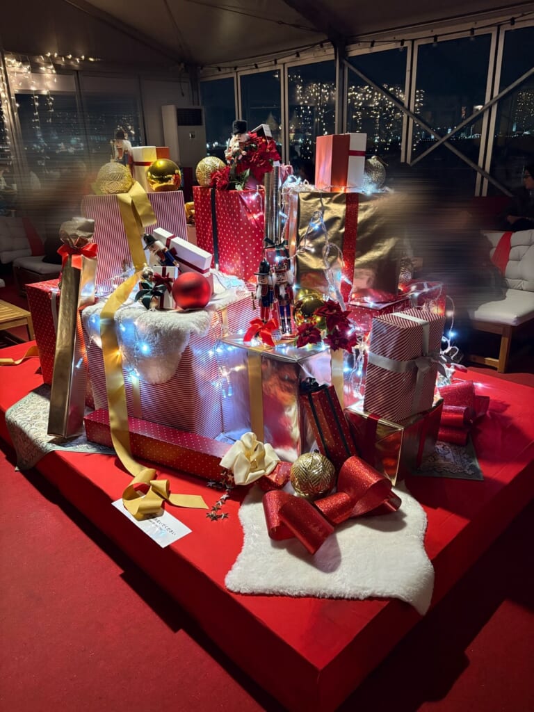中央に可愛いプレゼントのオブジェを囲むように2人掛け・4人掛けのイスとテーブルが並び、暖房の効いた暖かい空間でゆっくりと過ごせる天才エリア✨