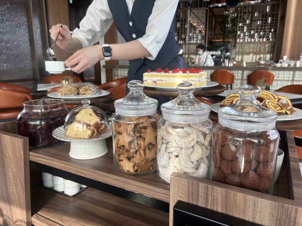 先ほどのセットとは別にこちらのスイーツワゴンもいただけるのが、フェアモント東京のスゴいところ🤍こちらはスタッフの方がテーブルを回ってくださり、全種類を一つずつ、またはお好みのスイーツを一つずつお選びいただけます!
