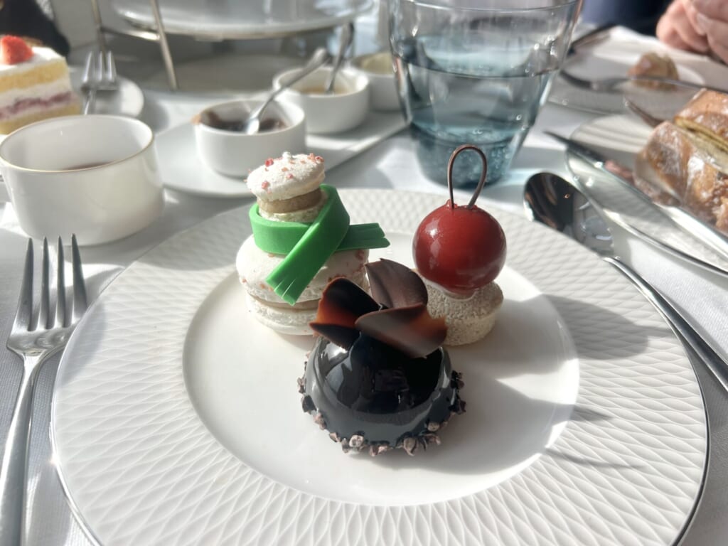 冬をモチーフとしたスイーツが可愛い!雪だるまのようなマカロンやオーナメントのようなストロベリー クリスマスボール パン ド ジェーヌがクリスマス感満載で食べるのが勿体なかったです!セイボリーもどれも丁寧な味付けでとても美味しかったです💕