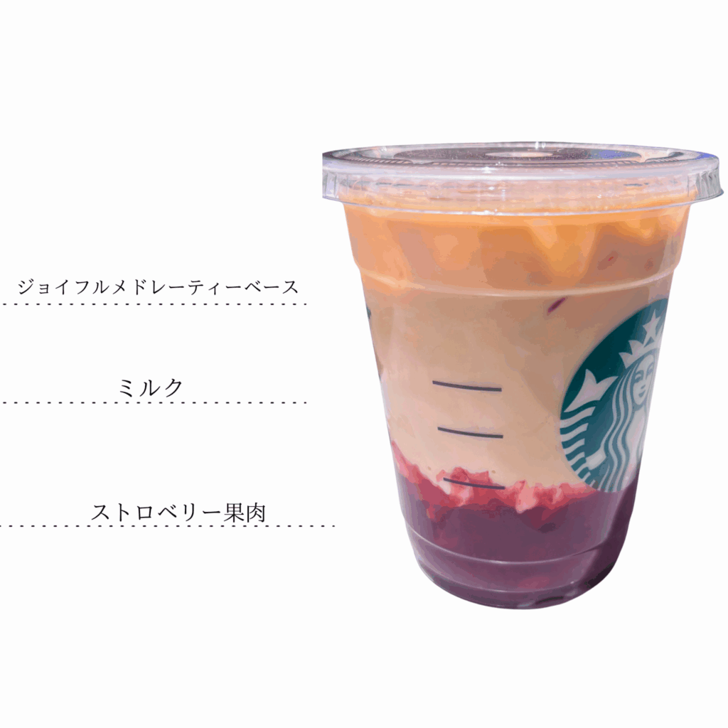 たっぷりと入ったストロベリー果肉にミルク、ジョイフルメドレーティーベースを重ねた贅沢なドリンク🍓✨