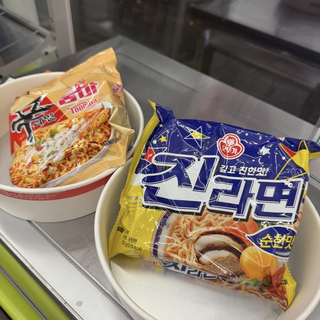 韓国では袋麺が1,000ウォンほどで購入でき、専用カップとチーズや卵を購入することで、コンビニでも本格的なラーメンを作って食べることができます!