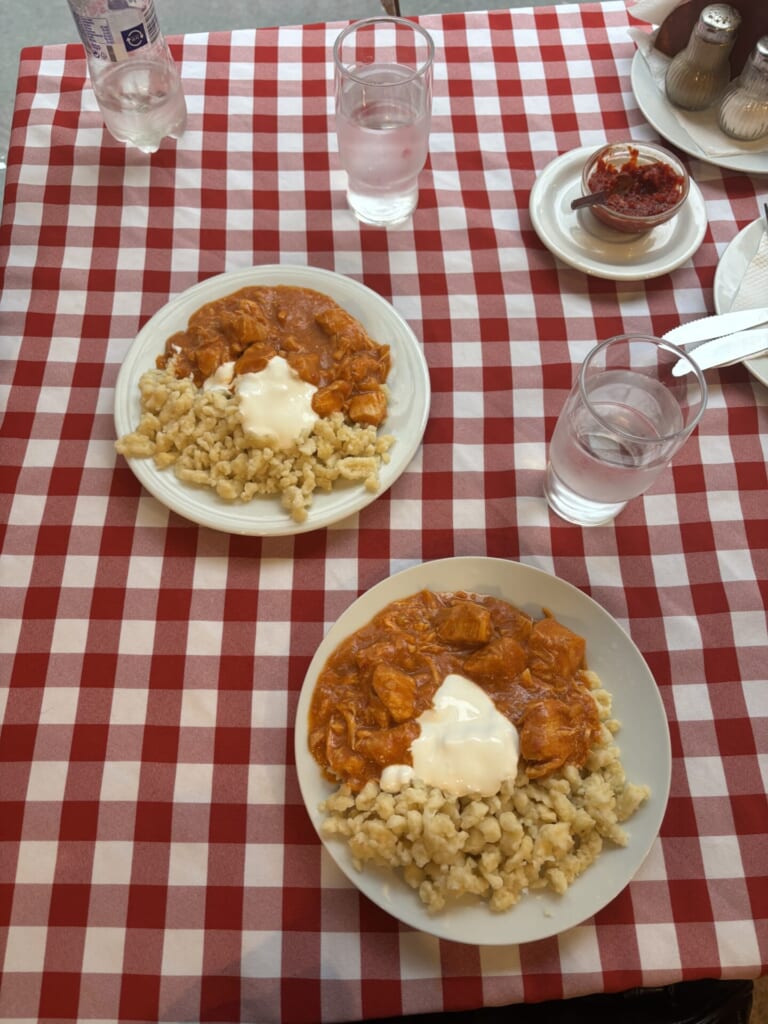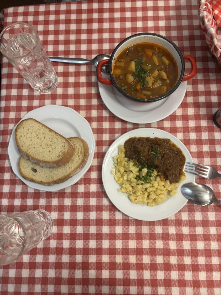 ここでは、グヤーシュスープ(パプリカが味の決め手の牛肉と野菜の煮込みスープ)と牛肉のプルクルト(パプリカパウダーを使って煮込んだシチューと小麦のダンプリングを組み合わせたメインディッシュ)をいただきました。😋サイズが予想できなかったこともありミニサイズも選びました!スープとプルクルトをお友達とシェアしました。どちらもパプリカの味はあまりしませんでしたが、優しい味で美味しかったです!💖ハンガリーのフードは日本人好みのものが多いと聞いていたのですが、本当にその通りでした!聖イシュトヴァーン大聖堂の近くです!