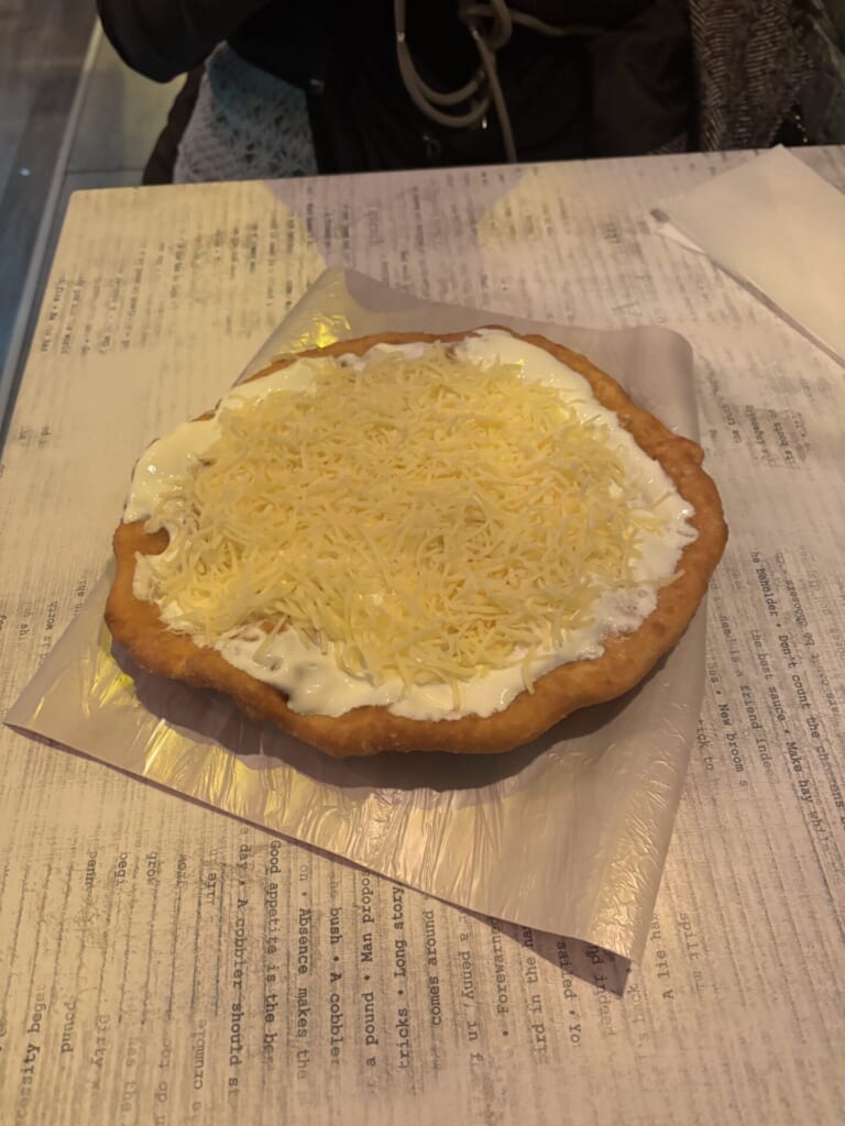 ランゴシュ(パン生地が揚げられているピザ)をいただきました!トッピングはチーズのみが定番と聞いたので、2人で1つを注文したのですが、量がちょうどよかったです。ボリューム満点だったのでシェアすることをおすすめします。サワークリームとチーズがトッピングされていて、美味しかったのですが少し重かったです!笑 聖イシュトヴァーン大聖堂の近くです!