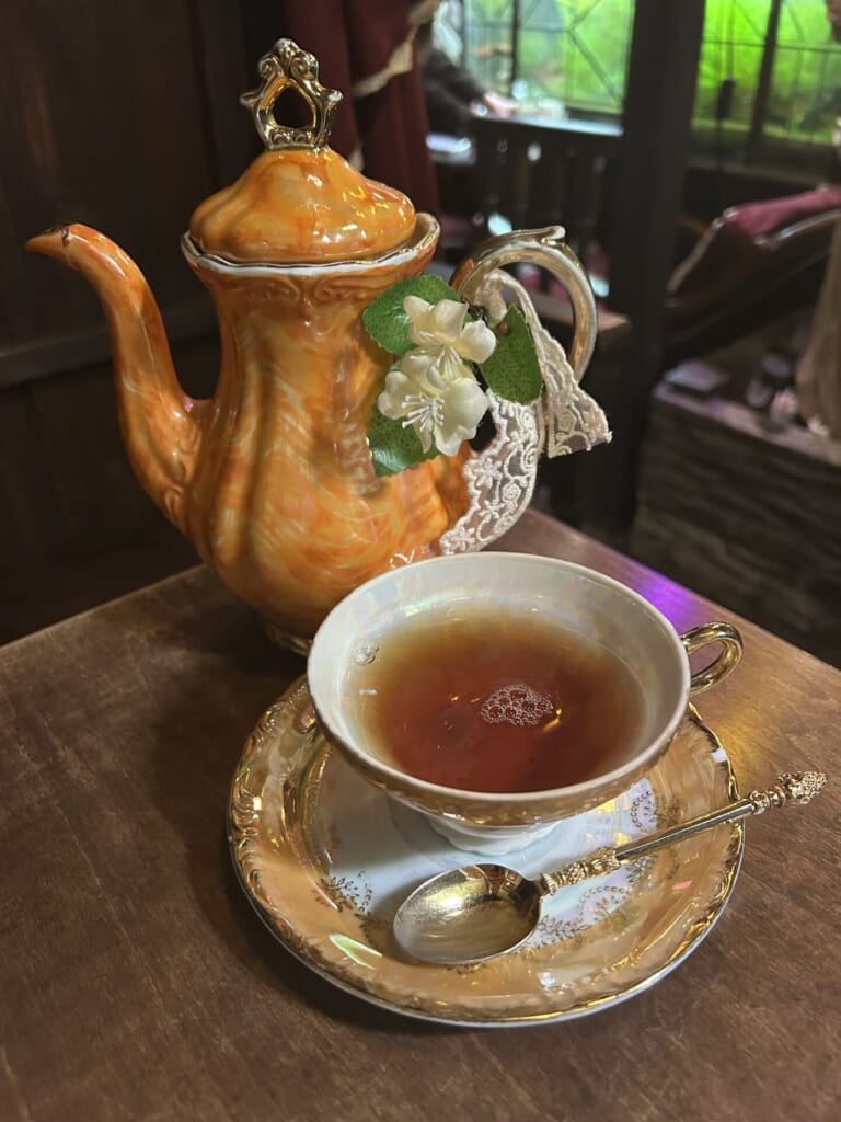また、写真のように、ポットの紅茶を注文するとアンティーク調のポットでお茶が運ばれます。ポットについたお花とレースがとてもゴージャスで、気分はまるでお姫様。ポットをはじめ、このお店は食器にもこだわっているため、注目してみてください!