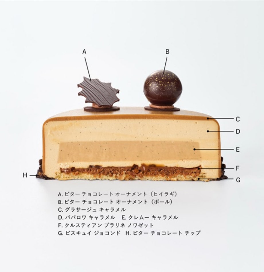 商品概要: くちどけ滑らかなババロワキャラメルと、濃厚なクレムーキャラメルを重ねて仕⽴てた、クリスマス限定のキャラメルケーキ。