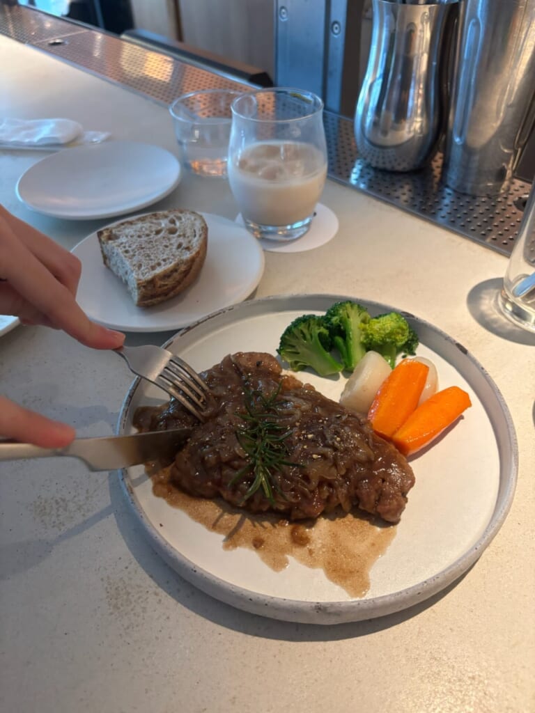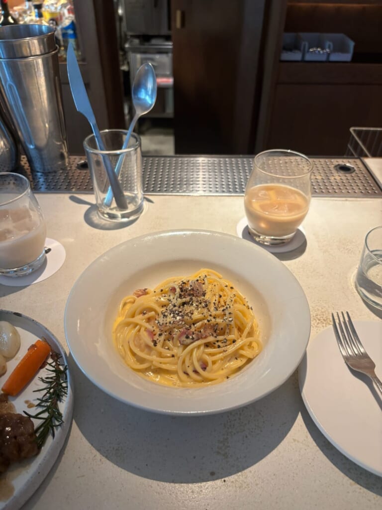 私は、アイスのチャイを頼み、カルボナーラ、豚肉のソテーをお友達とシェアしました。