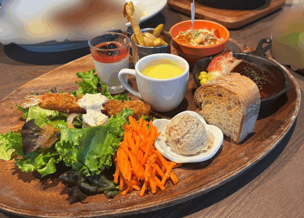 サラダやスープ、デザートものっており、一皿で大満足できる一品です。