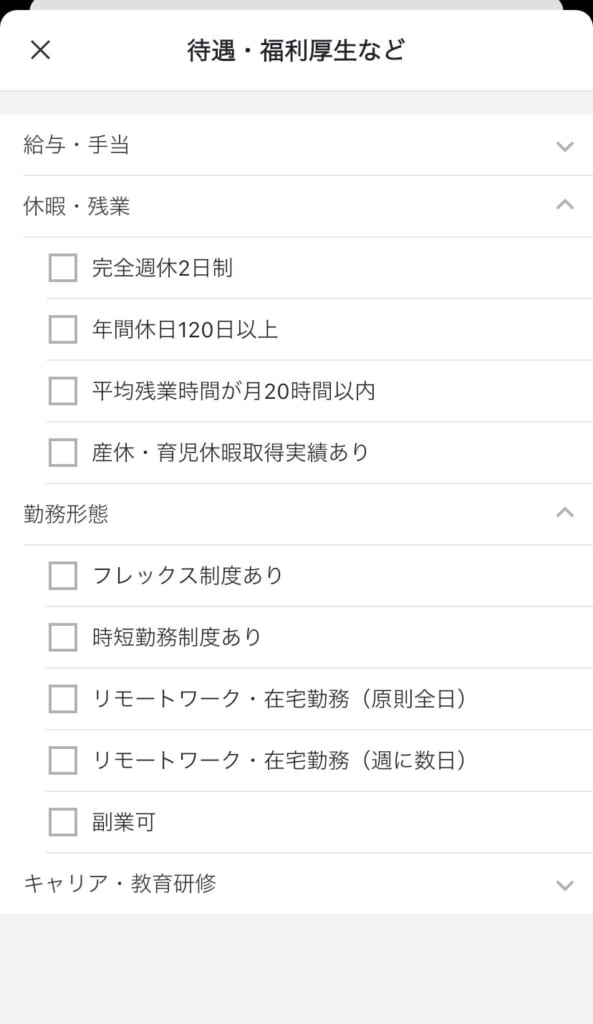 このように、年間休日120日以上や産休・育休休暇取得実績ありなどの休暇やリモートワーク・副業可など勤務形態まで自分の希望を複数選択し検索することができます!