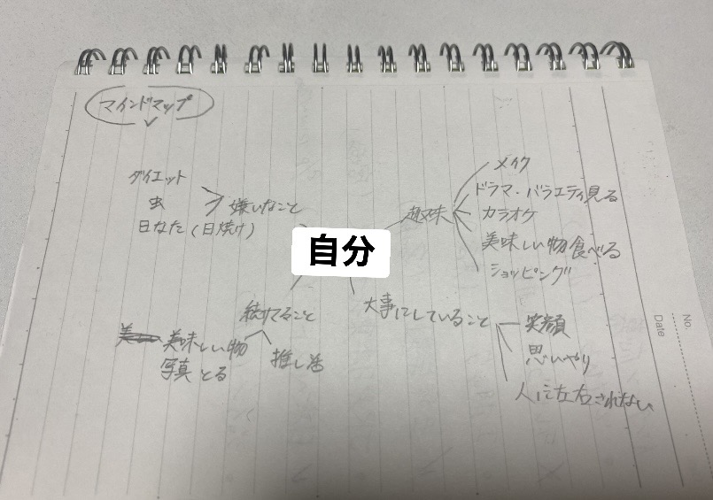 実際に、私が授業で取り組んだ自己分析は「マインドマップ」になります↓