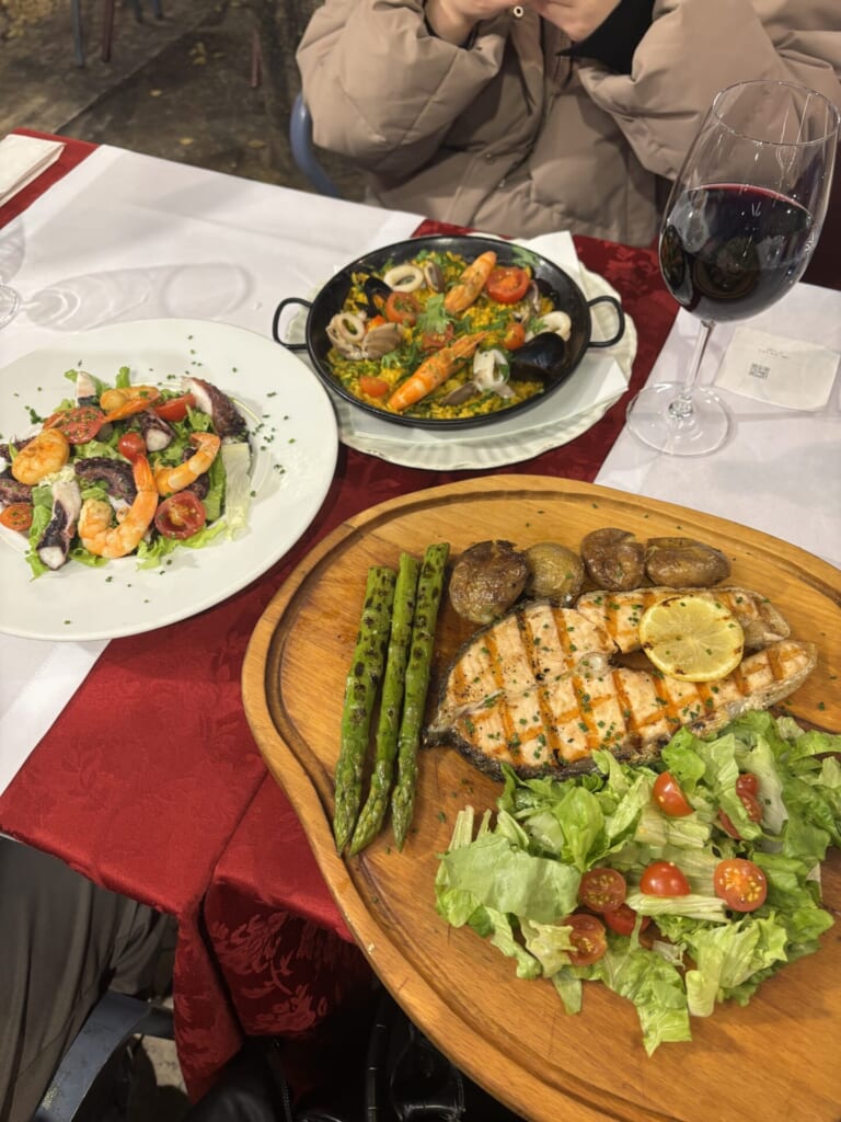 お魚料理からサーモンのグリル、お米料理からシーフードのパエリア、野菜料理からタコのサラダを注文しました。🤤💗どの料理にも海鮮がふんだんに使われていてとっても美味しかったです。
