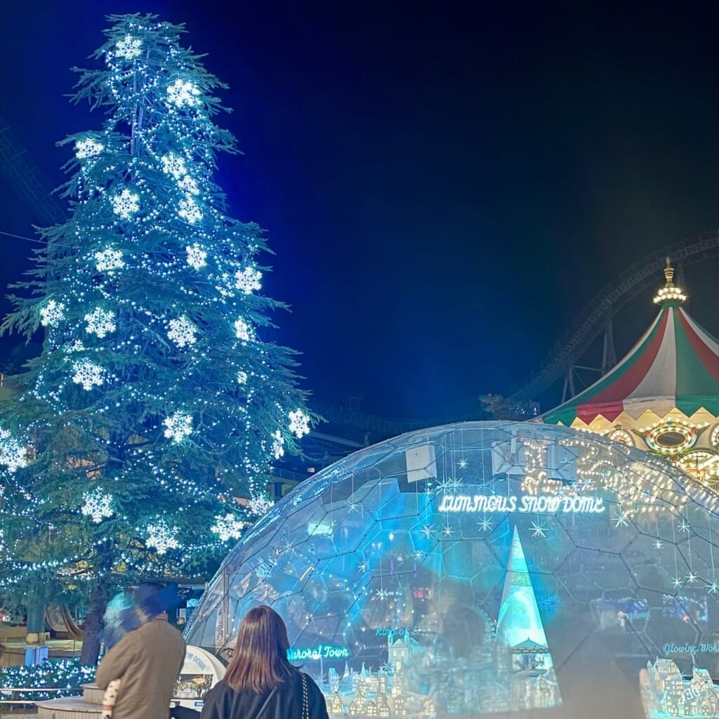ラクーア前のツリー、スノードーム、メリーゴーランド。テーマパークのイルミネーションならではのメルヘンな1枚を撮影することができました!