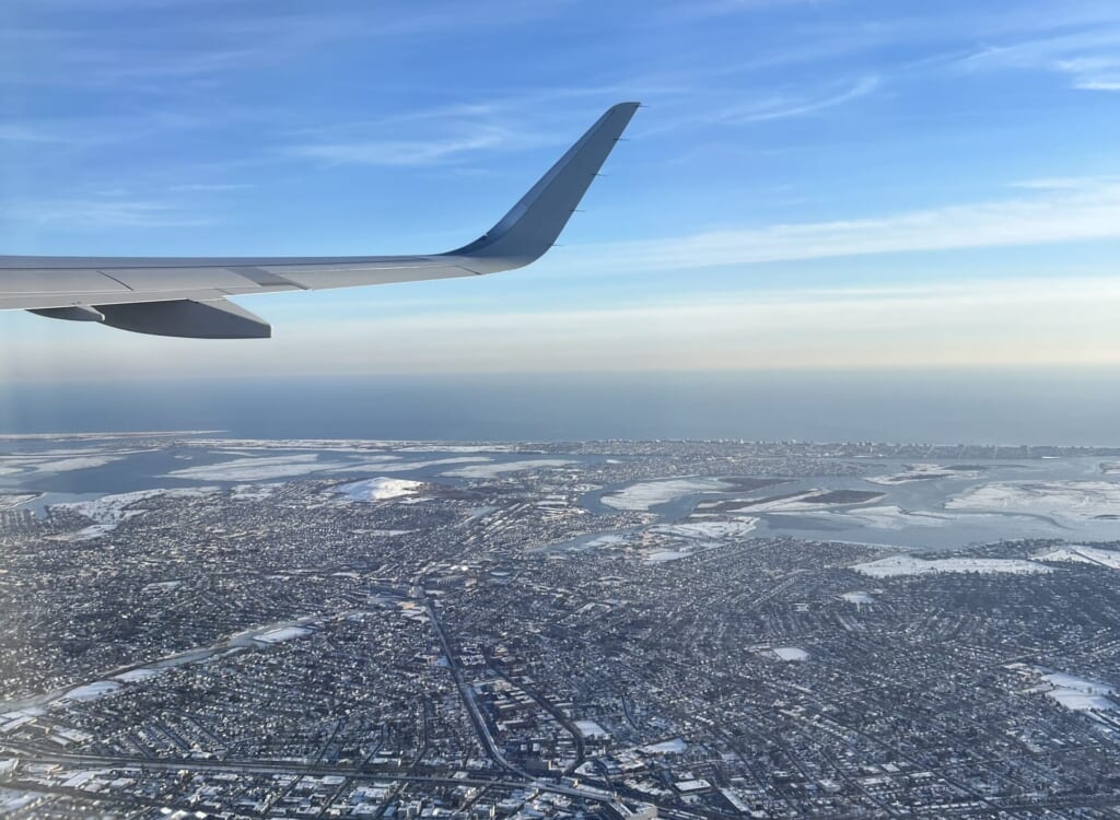 機内の窓からは、降り積もる雪が見えてワクワク☃️旅のはじまりです!✈️