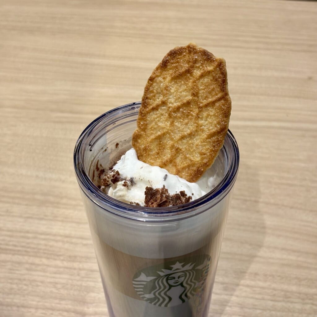 また、別添えのワッフルクッキーがとてもよかったです! フラペチーノにディップして食べるのも相性ばっちりですが、そのまま食べてもすごく美味しかったです! 単品で売っていても食べたいレベルで気に入りました!