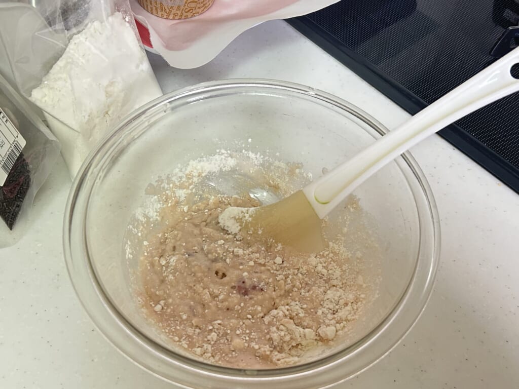 2. ヘラで軽く混ぜてから、ホットケーキミックスを入れて、なめらかになるまで混ぜる。