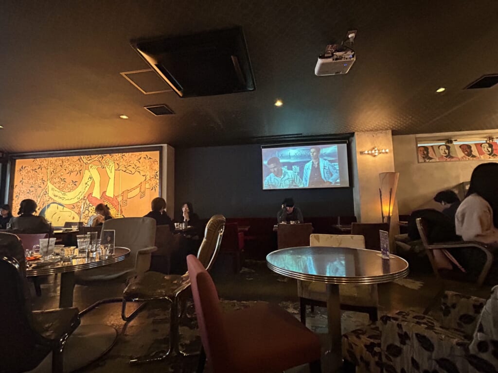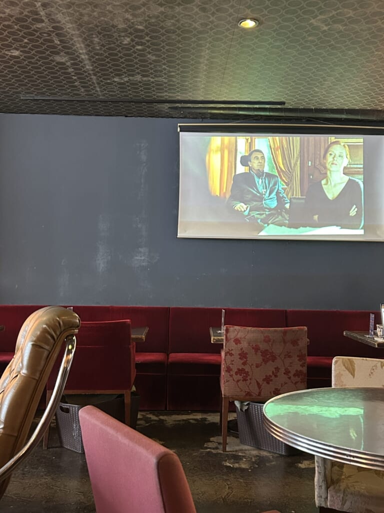 アンティークな家具が特徴的。大きなスクリーンには洋画が流れていました。