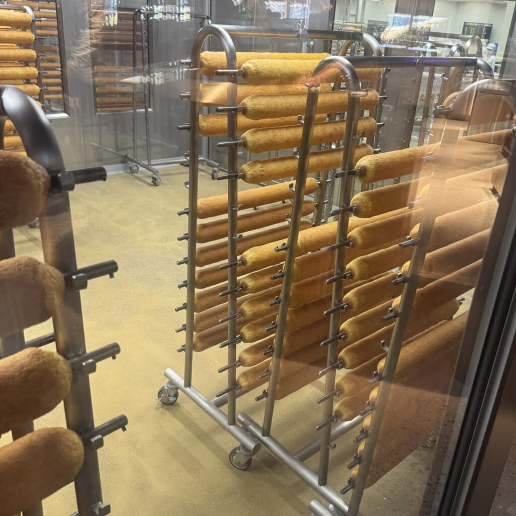 普段あまり見ることのないバームクーヘンの製造工程をガラス越しに見学することができます。