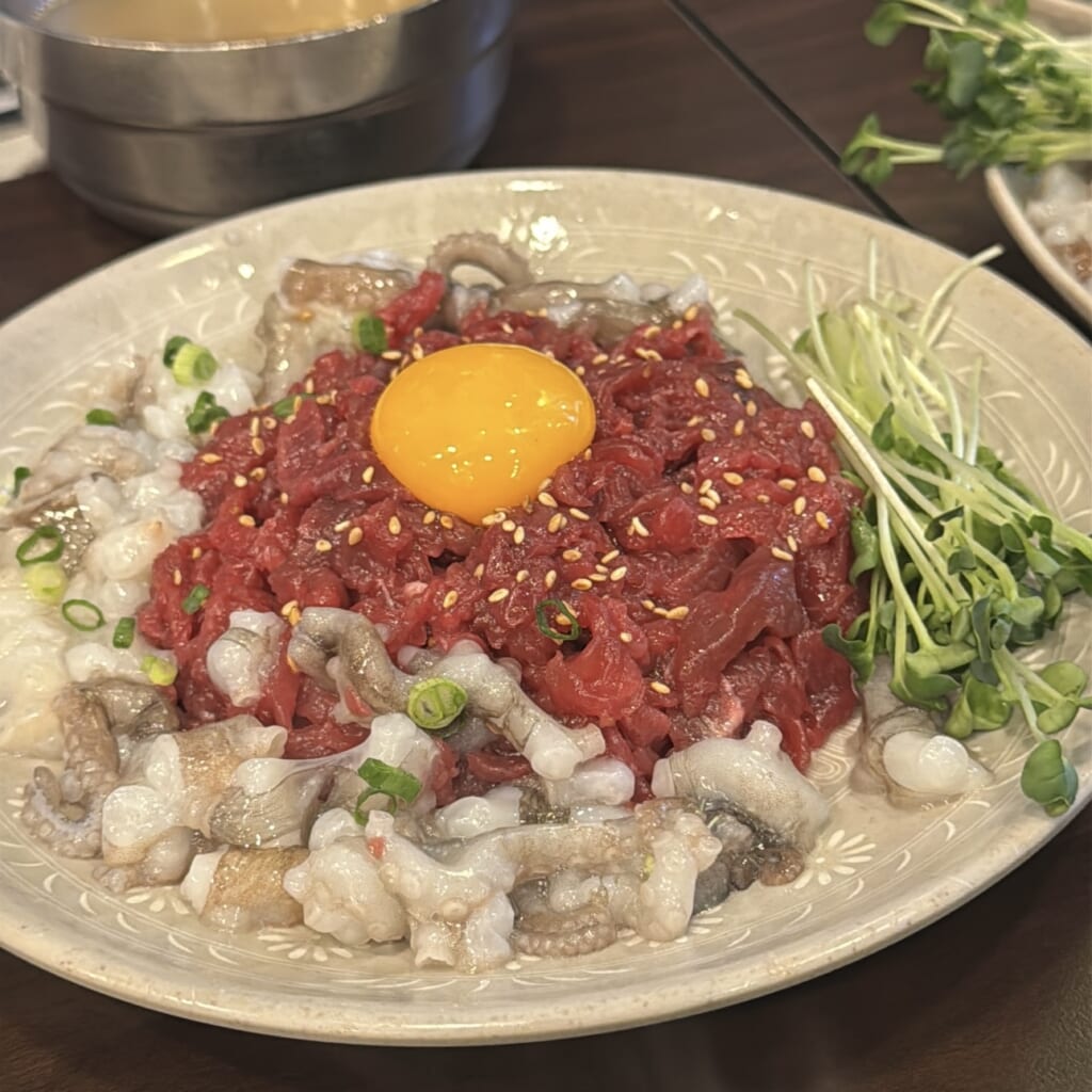 人気メニューは、韓国産牛肉のユッケと生きたまま提供される「サンナッチ(活きたこ)」がセットになっている「ユッケナクチタンタイ」です。
