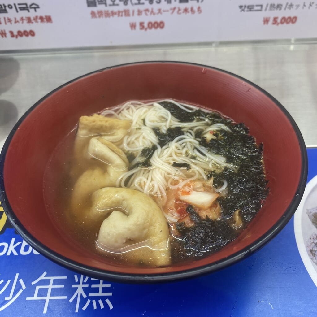 優しい味の温かいそうめんにキムチと韓国おでんが入っていて、体の芯から温まります。