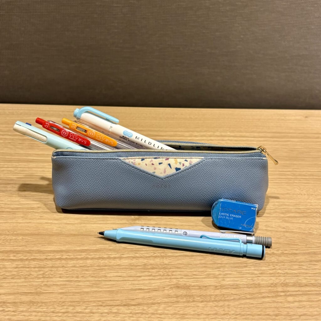 筆箱とその中身は高校時代のものをほとんどそのまま使っています! 私は黒・赤・青・オレンジのボールペンと水色のマーカーを持っていますが、最低限黒と赤のボールペンはあった方がいいと思います!