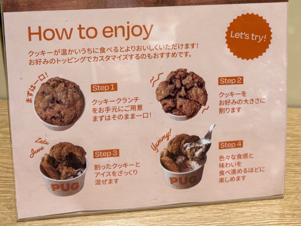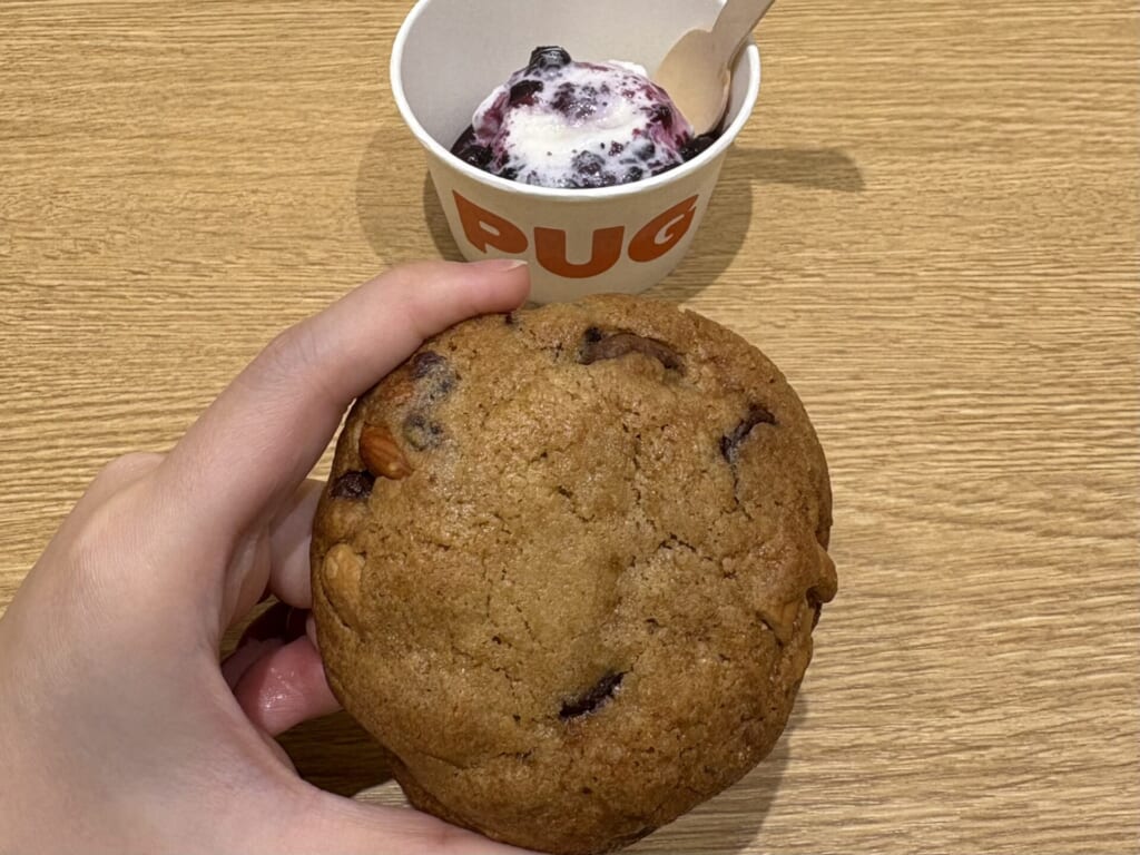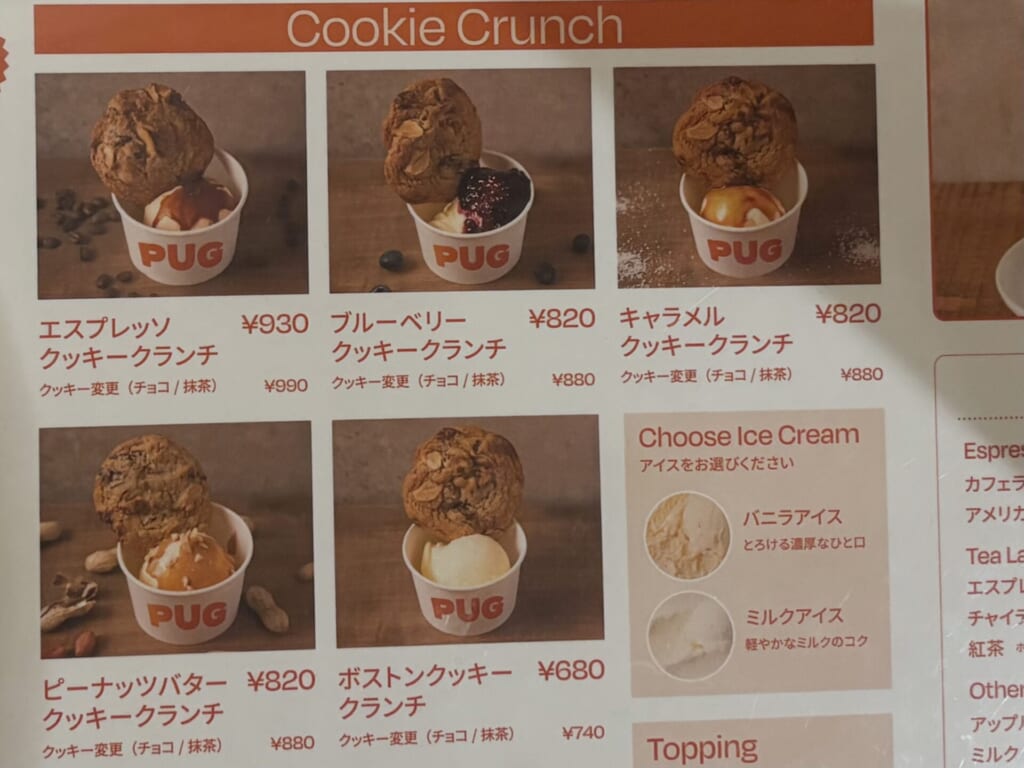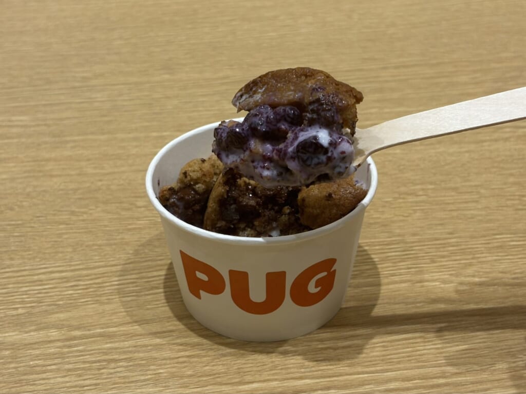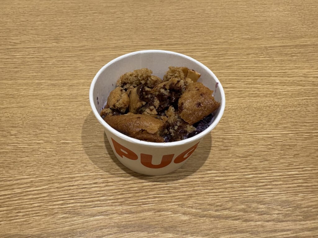 クッキーを崩しながら食べる「新感覚のクッキー体験」が楽しめるスイーツで、PUGのシグネチャーメニューだそうです。アイスクリームはバニラとミルクの2種類から選べて、追加料金でクッキーのフレーバーをチョコ、抹茶にも変更することができます。