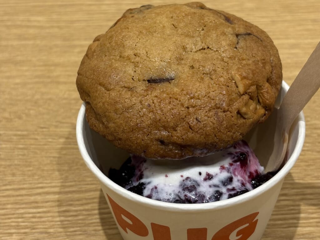 温かいクッキーとひんやりとしたアイス、そしてクッキー生地に練りこまれたチョコレートの濃厚な甘さとさっぱりとしたブルーベリーソースの甘さがぴったり。さらに食べ進めていくと、溶けたアイスがクッキーに染み込んで食感のしっとり度がUP。セットドリンクで注文したホットミルクの優しい甘さも相性抜群でした。