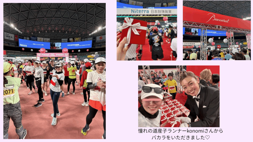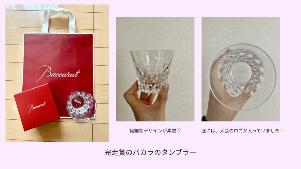 さて、実はこの大会は、完走賞が豪華ということで有名なんです!かつてはティファニーのネックレスがプレゼントされていました。今年は、去年に引き続き、バカラのタンブラーをいただきました! 21歳にはまだ早すぎるのでは?というくらいオシャレで、大人なデザインでとても嬉しかったです♡ 他にも沢山の完走賞をいただき、足取りもレース中と比べて、嘘のように軽くなっていました笑
