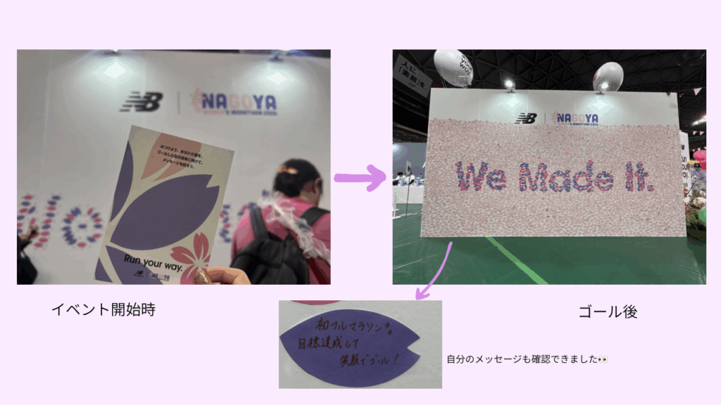 そして、なんといっても1番感動したのは、メッセージボード! 事前EXPOに行った際にはスカスカだったのですが、大会後に見ると壁一面のメッセージが!多くのランナーが目標を綴ったメッセージボードからは、強い力を感じました💪 メッセージには、具体的な目標を書いている方も多かったですが、”笑顔で!” ”元気に!” ”楽しく!” といった明るい目標を掲げているものが目立ちました✨ このようにランナー全体のキラキラ感こそが、この大会の醍醐味に感じました。