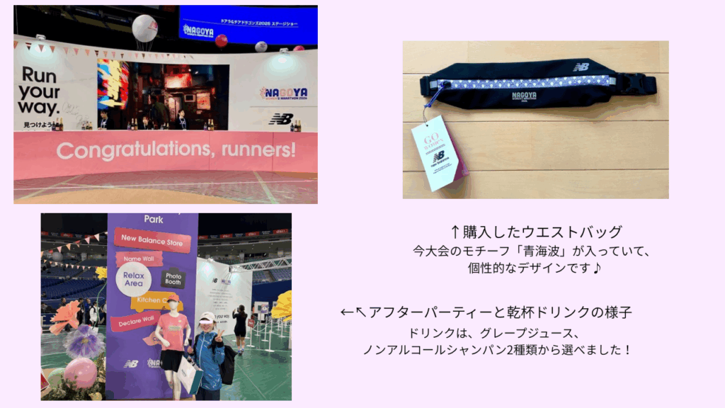 ゴール後は、ニューバランスのブースを訪れました! アフターパーティーとして、乾杯ドリンクをいただきました😋 そして、ブースで使えるランナー限定の1000円OFFチケットをいただきました!チケットを使うことで、キッチンカーでポトフやカレーと交換できたり、グッズを購入することができました。 私は、この思い出を何か形に残しておきたいと思い、今大会限定グッズのウエストバッグを購入しました!これを使って、次の大会に向けて、沢山練習したいです!