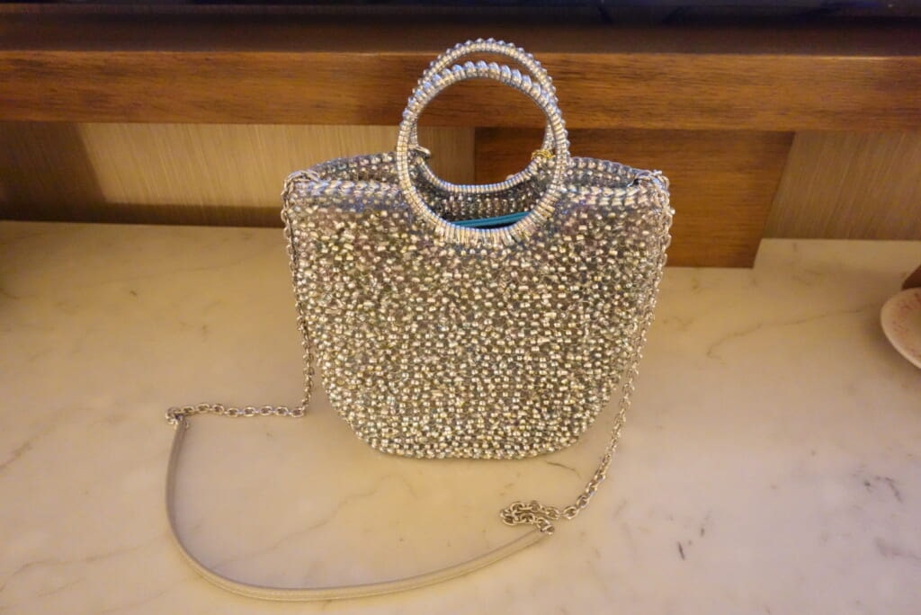 たくさん種類がありましたが、シルバーをベースに、水色やピンクなどのハワイっぽい色味を含んだ持ち手付きワイヤーバッグに決定です⭐️(画像では色味が分かりにくいですね泣)