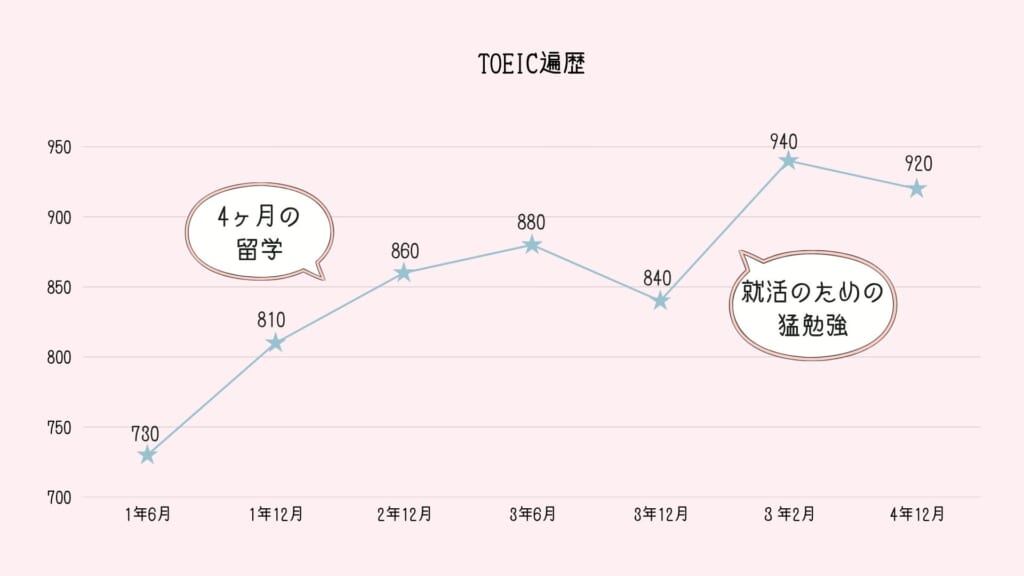 まず私のTOEICのスコア遍歴はこんな感じです。