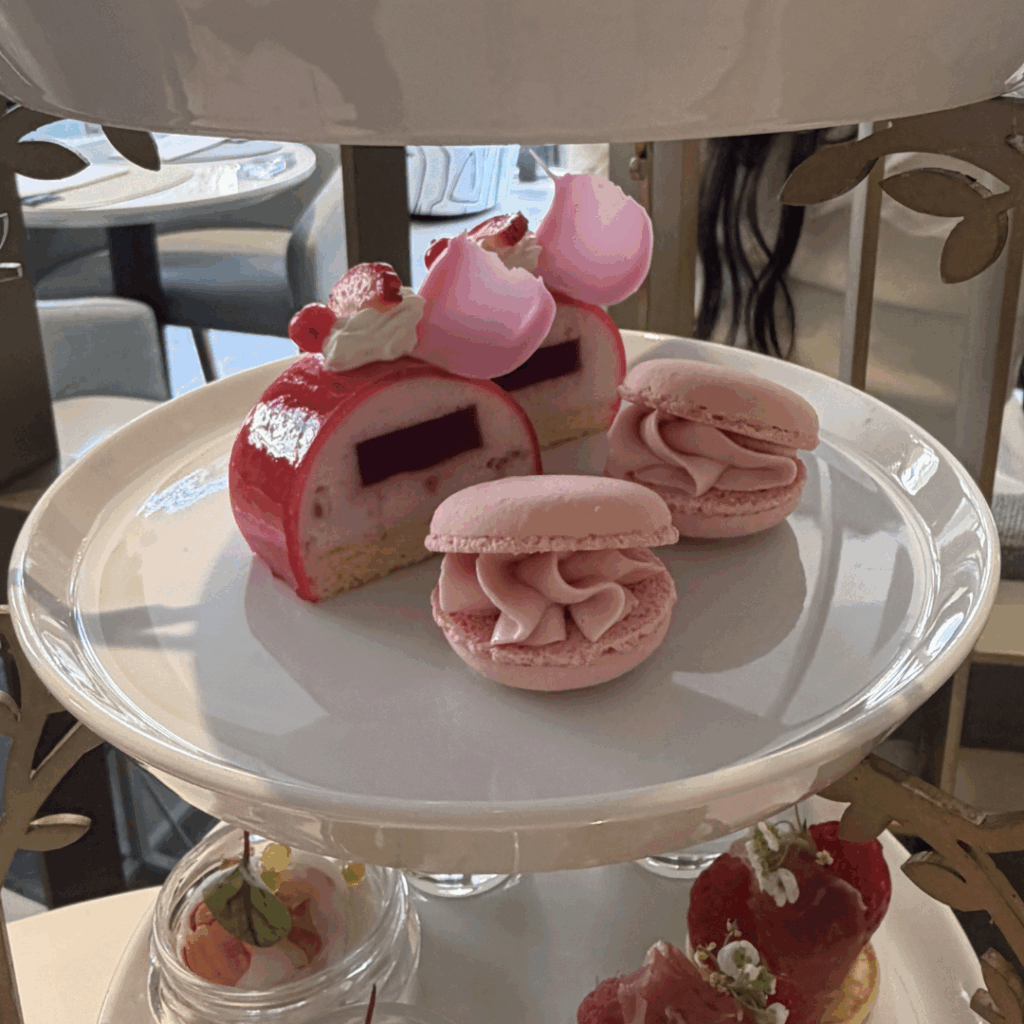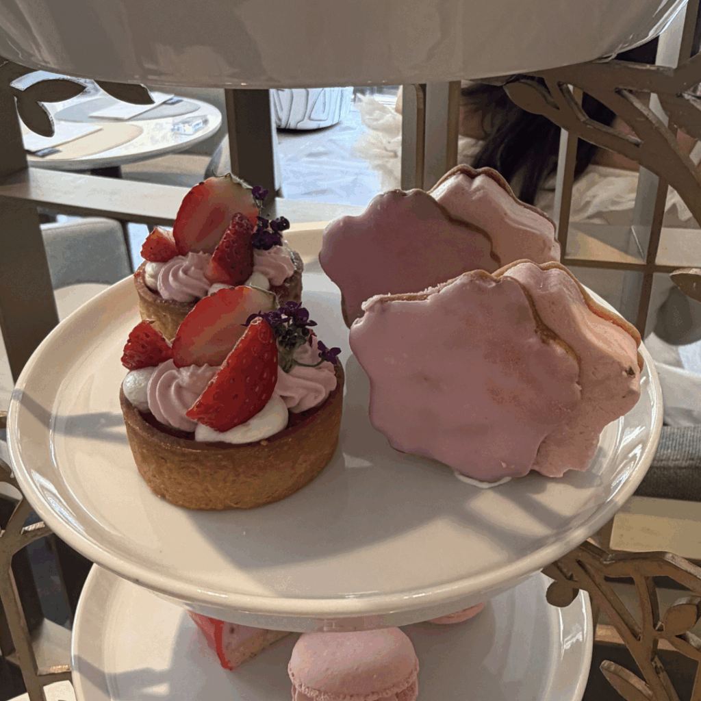 いちごのヴェリーヌや桜香るいちごタルトなど、パティシエこだわりのスイーツが並び、見た目もとても華やか。さらに、桜と蝶のチュイールが飾られたスペシャルパフェもあり、まるでお花見をしているような気分になれる贅沢なティータイムでした。