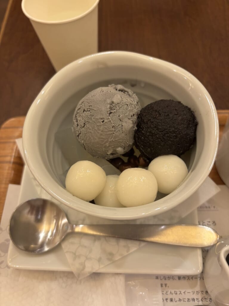 胡麻の風味がとっても濃厚であるとともに、白玉がとってももちもちで甘党さんは絶対好きな和のテイストです!また、黒蜜のかける量を調整することで自分のお好みの甘さで食べることができます。