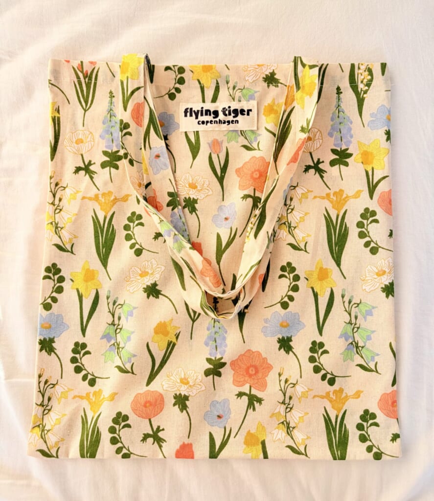フライングタイガーさんでは、購入時に紙袋の用意がなく、袋が必要な場合はこちらのようなトートバッグを購入するシステム!春らしいデザインが多く、ピクニックグッズを入れるのにも最適!!