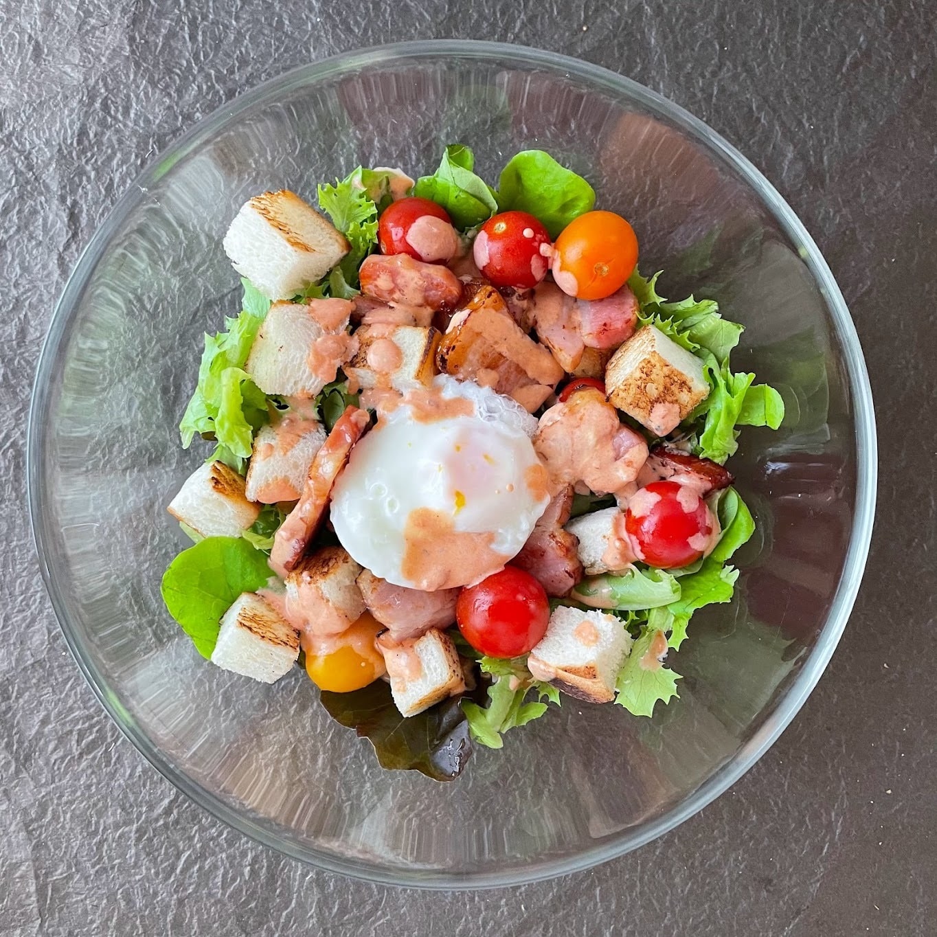 4. 器にすべての食材を入れ、温泉卵をのせた後、2のドレッシングをかけて、できあがり!!